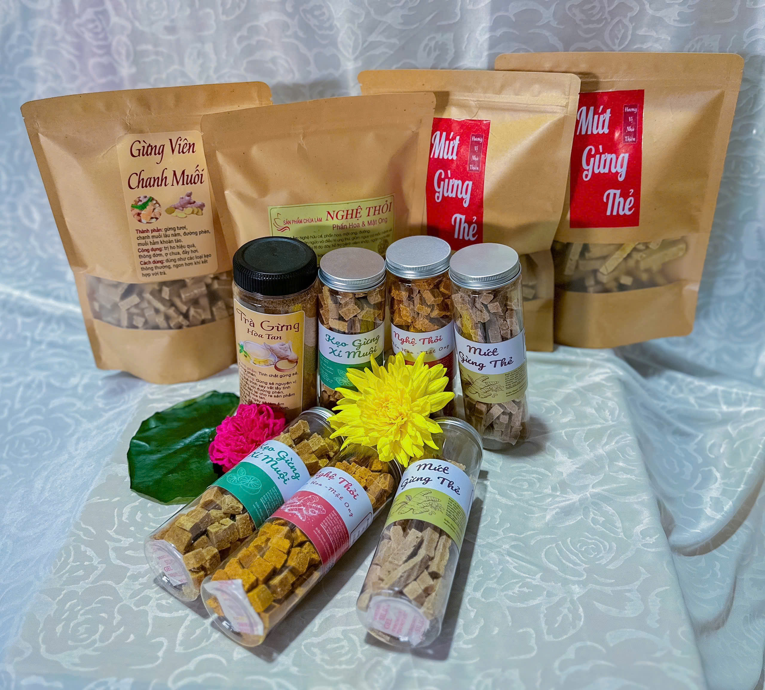 Với ưu thế về các loại cây hoa màu như Gừng Nghệ là cây gia vị cũng là dược liệu phổ biến của nền Nông nghiệp Việt Nam. Lợi dụng thế mạnh sản xuất, Hộ kinh doanh Phan Ngọc Thanh tận dụng nguồn nguyên liệu sẵn có chế biến thành các món kẹo mứt truyền thống bên cạnh đó sáng tạo cách tân thành các sản phẩm tiện lợi vừa là thực phẩm vừa mang dược tính hỗ trợ sức khoẻ. Cụ thể: